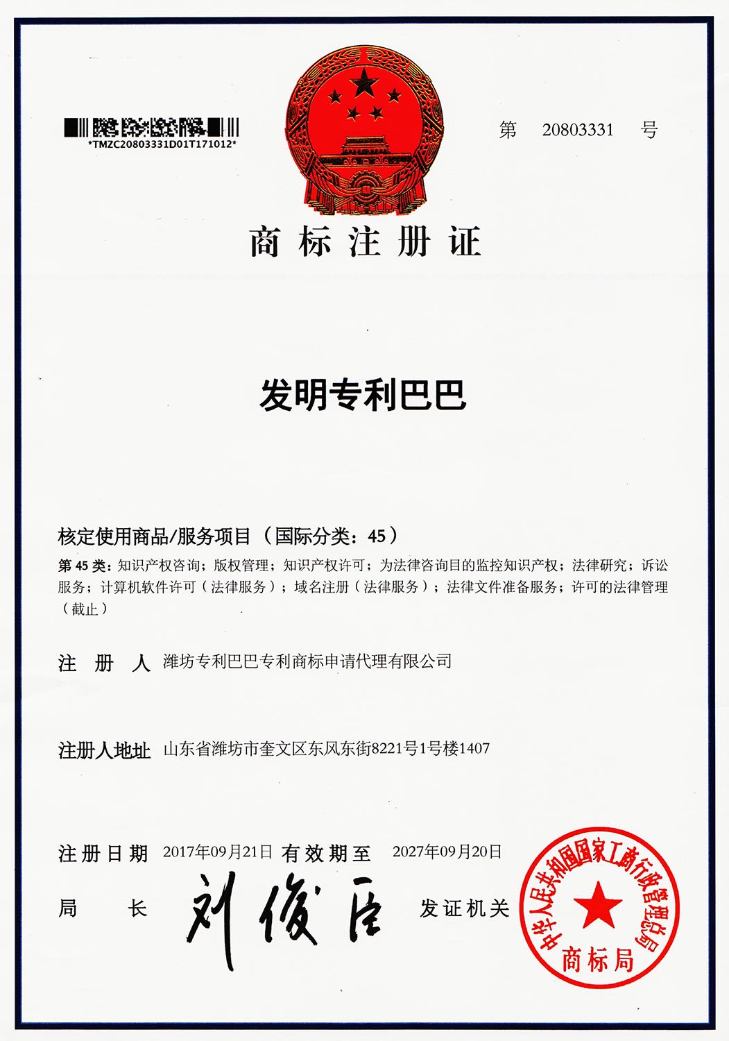 发明专利巴巴是潍坊专利巴巴专利商标申请代理有限公司的注册商标,由潍坊专利巴巴专利商标申请代理有限公司于2016年7月28日提交商标注册申请,发明专利巴巴的商标注册号是20803331,发明专利巴巴品牌商标专用权期限是2017年09月21日-2027年09月20日。